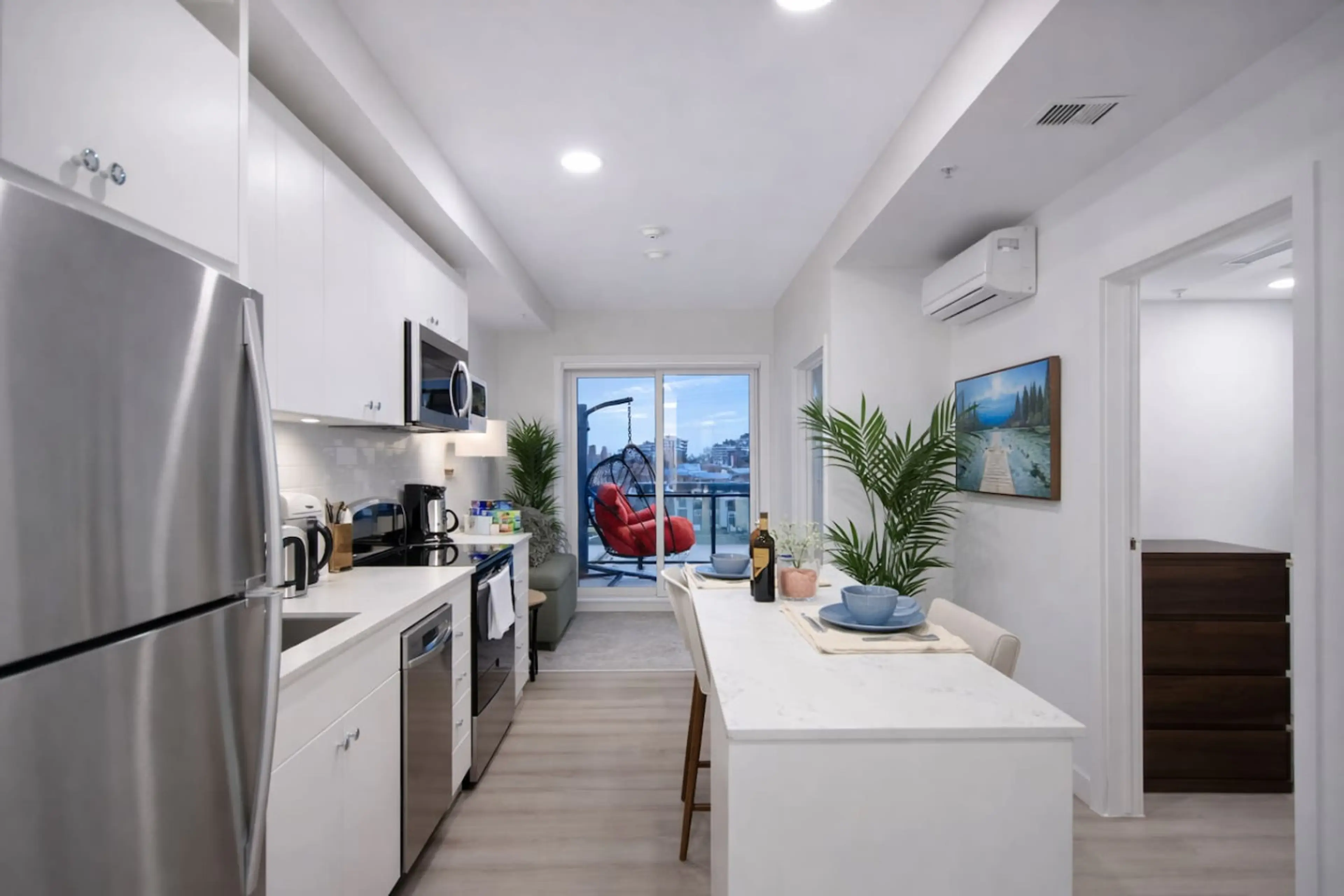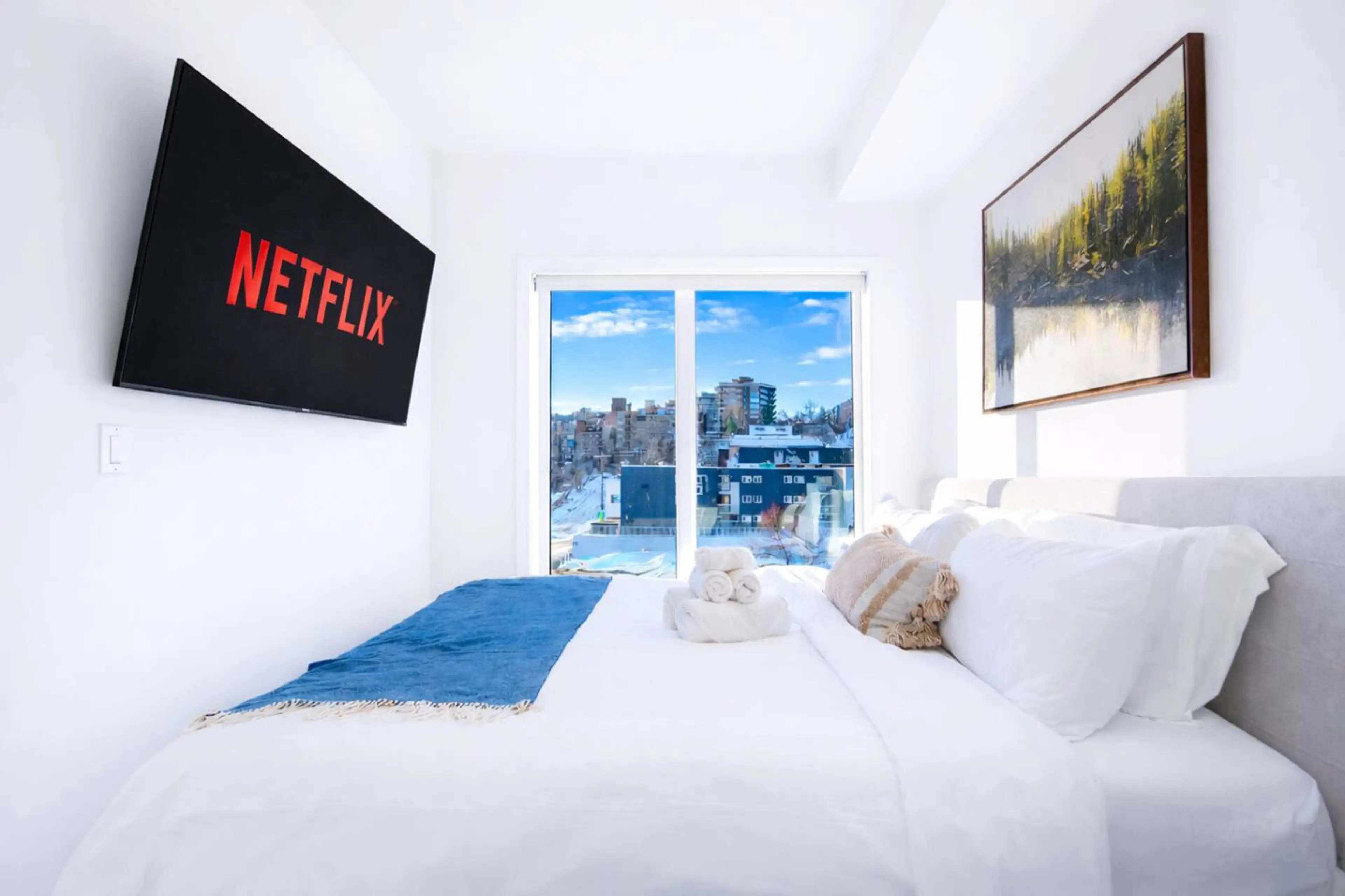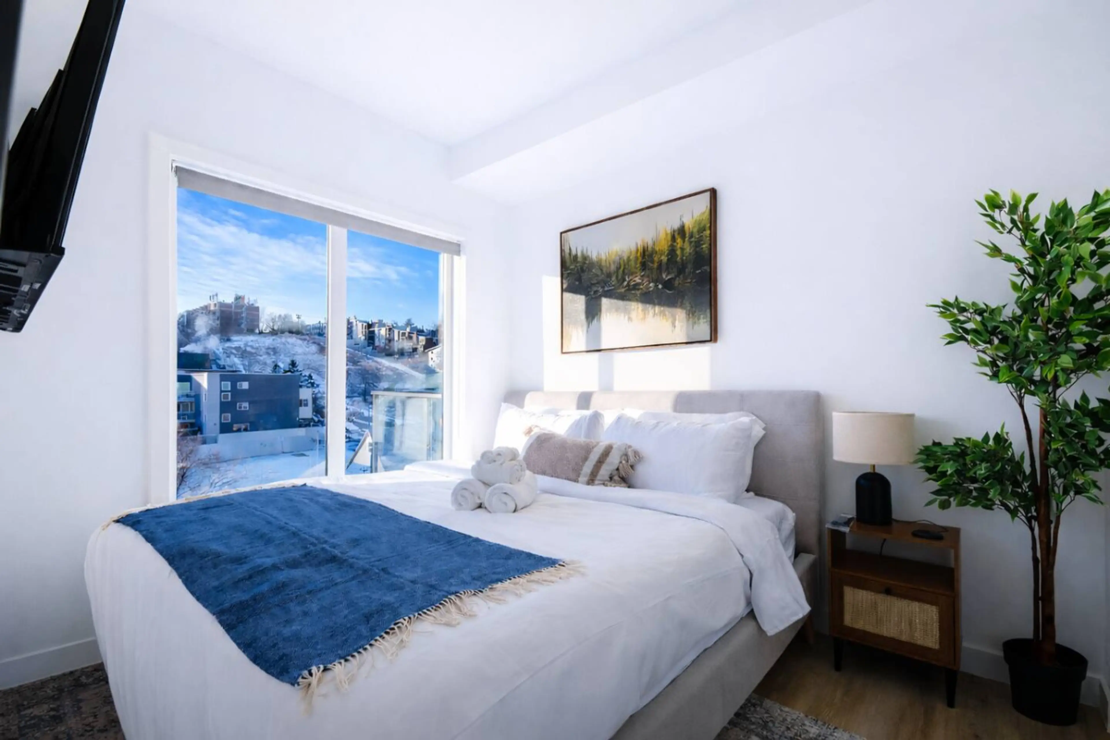Modern 1BR condo with stunning Calgary downtown skyline views at 455 1st Ave NE. Ideal for business travelers and couples. Enjoy a 65” Smart TV in the living room and 58” Smart TV in the bedroom, fast Wi-Fi, full kitchen, in-suite laundry, and a bright open layout. Steps from Bow River pathways and ...